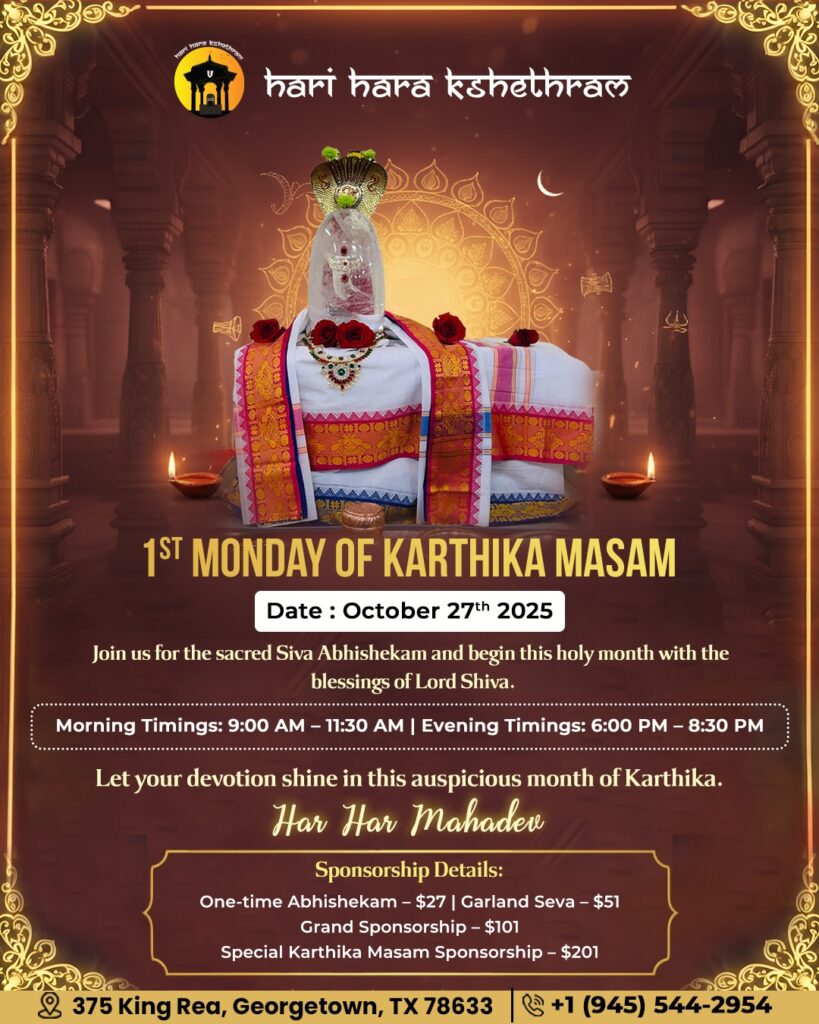 At Hari Hara Kshethram Temple in Georgetown, Texas, the First Monday Siva Abhishekam in Austin marks the spiritual beginning of this sacred month — a time when the mind turns inward and devotion becomes a living experience.In this blog, we explore the spiritual depth of this sacred observance, the meaning of preparing for Lord Shiva’s worship, and how devotees can participate meaningfully in this year’s Karthika Masam celebrations in Austin.