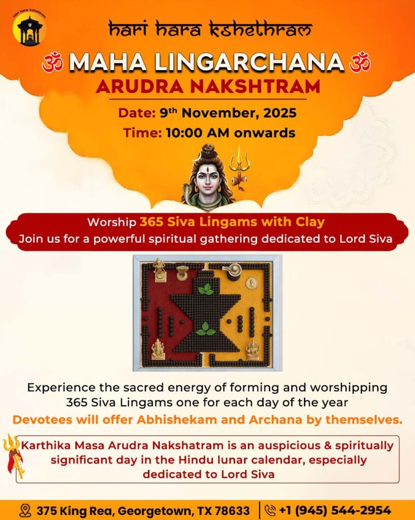 Join us at Hari Hara Kshethram Temple, Georgetown, TX, on 9th November 2025 at 10 AM for the sacred Maha Lingarchana during Arudra Nakshatram 2025 in Austin. Experience divine energy, participate in Lord Siva Abhishekam in Austin, and celebrate Karthika Masam with devotion and unity.