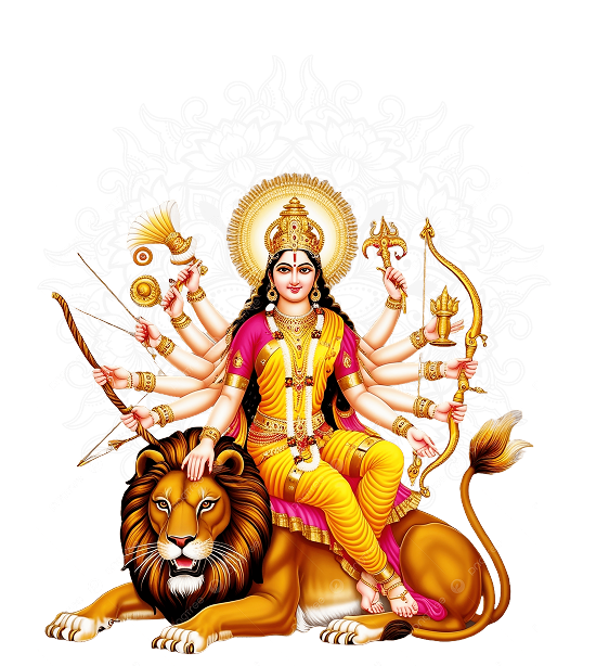 According to the Devi Mahatmya, the demon Mahishasura grew powerful through a boon and defeated the gods. To protect the world, the divine energies of the gods manifested as Goddess Durga. Riding a lion and armed with celestial weapons, she fought Mahishasura for nine nights and finally destroyed him on the tenth day. This victory symbolizes the triumph of divine power over evil.